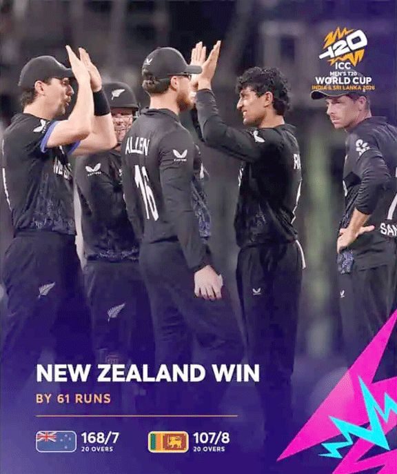 کولمبو، 25 فروری (یو این آئی) کپتان مچل سینٹنر (47 رنز اور ایک وکٹ)، راچن رویندرا (32 رنز اور چار وکٹ) اور کول میک کونچی (ناٹ آؤٹ 31 رنز) کی شاندار کارکردگی کی بدولت نیوزی لینڈ نے ٹی-20 ورلڈ کپ کے سپر ایٹ مقابلے میں بدھ کو سری لنکا کو 61 رنز سے شکست دے دی۔