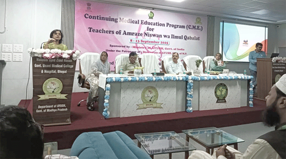 بھوپال:09؍ستمبر:حکیم سید ضیاء الحسن، گورنمنٹ (خود مختار) یونانی میڈیکل کالج، بھوپال کے شعبہ امراضِ نسواں و قبالت میں 6 روزہ سی.ایم.ای. (CME) پروگرام کا آغاز 8 سے 13 ستمبر 2025 تک ہوا، جس کا افتتاح 8 ستمبر کو کالج کے آڈیٹوریم میں کیا گیا۔افتتاحی تقریب کے مہمانِ خصوصی ڈاکٹر منیش شرما، چیف میڈیکل اینڈ ہیلتھ آفیسر (CMHO)، بھوپال تھے۔پروگرام کے خصوصی مہمانوں میں ڈاکٹر آر. کے. گپتا، جواینڈ ڈائریکٹر، ڈائریکٹوریٹ آف آیوش؛ ڈاکٹر ورونا پاٹھک، صدر، گائنی اینڈ آبس (Gynae & Obs)، آر. کے. میڈیکل کالج، بھوپال؛ اور ڈاکٹر عارف زیدی، سابق ڈین، ہمدرد طبیہ کالج شامل تھے۔سی.ایم.ای. پروگرام کی چیئرپرسن ڈاکٹر ایس. نفیس بانو نے اپنے خطاب میں کہا کہ اس پروگرام کا مقصد خواتین کی صحت سے متعلق ہے۔