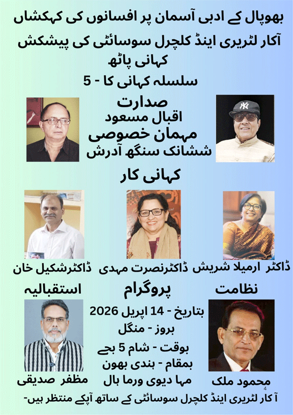 بھوپال:13؍اپریل:(پریس ریلیز)کہانی پاٹھ( سلسلہ کہانی کا – 5 ) کا پروگرام بتاریخ – 14 اپریل 2026بروز – منگل شام 5بجے بمقام – ہندی بھون کے مہا دیوی ورما ہال میں منعقد کیا جا رہا ہے -جس کی صدارت اردو ادب کے سینئر افسانہ نگار اور شاعر اقبال مسعود فرمائیں گے اور مہمان خصوصی ہوں گے معروف ادیب ششانک سنگھ آدرش – ہندی ساہتیہ اکادمی دہلی کی ممبر اور معروف کہانی کارڈاکٹر ارمیلا شریش ، مدھیہ پردیش اردو اکادمی کی ڈائریکٹر اور مشہورو معروف شاعرہ ،افسانہ نگار ڈاکٹر نصرت مہدی ، سینئر افسانہ نگار ڈاکٹرشکیل خان اپنی کہانیاں اور افسانے سنائیں گے – نظامت کے فرائض انجام دیں گے محمود ملک اور استقبالیہ کلمات پیش کریں گے مظفر اقبال صدیقی –