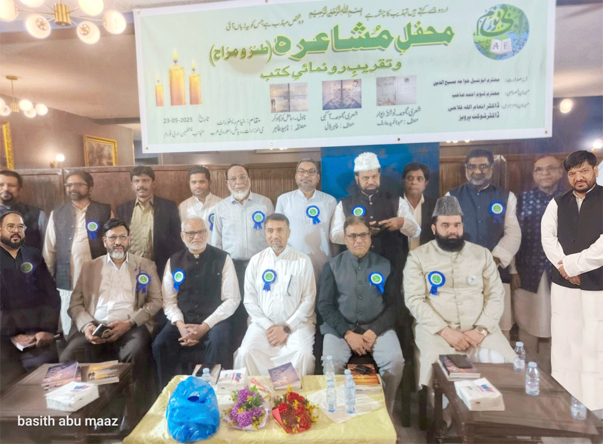 ریاض (سعودی عرب ) 25 مئی -( ای میل ) معروف ادبی تنظیم ادبی فورم (IFC)، ریاض کے زیرِ اہتمام طنز و مزاح پر مبنی ایک شاندار محفلِ مشاعرہ کا اہتمام کیا گیا۔ یہ باذوق محفل ہوٹل خیام، حارہ میں شام 7بجے سے رات 11:30 بجے تک جاری رہی، جس میں ریاض کے ممتاز ادباء و شعراء نے شرکت کی۔