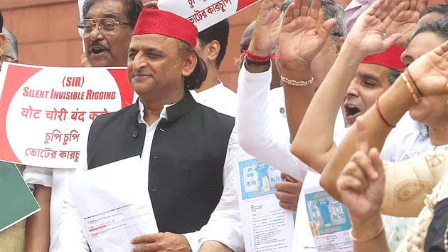 نئی دہلی19اگست: پارلیمنٹ میں ایس آئی آر عمل پر تنازعہ جاری ہے۔ منگل کو اپوزیشن نے انتخابی عمل میں مبینہ گڑبڑ اور ’ووٹ چوری‘ کے الزامات کے ساتھ الیکشن کمیشن کے خلاف احتجاج کیا۔ اس موقع پر کانگریس کے صدر ملکارجن کھڑگے، رکن پارلیمنٹ پرینکا گاندھی، سماج وادی پارٹی کے سربراہ اکھلیش یادو اور ‘انڈیا بلاک کے دیگر رہنما شامل تھے۔ سماج وادی پارٹی کے رکن پارلیمنٹ اور سربراہ اکھلیش یادو نے میڈیا کو حلف ناموں کی کاپی دکھائی اور کہا کہ 18 ہزار لوگوں کو ووٹ دینے سے روکا گیا اور ان کے نام فہرست سے خارج کر دیے گئے۔ انہوں نے بتایا کہ انہوں نے متعدد حلف نامے دیے اور ای میل بھی بھیجے لیکن انتظامیہ دباؤ ڈال رہی ہے۔ اکھلیش یادو نے مزید کہا، ’’اتر پردیش میں ضمنی انتخابات کے دوران ووٹوں کی ‘ڈکیتی ہوئی اور پولیس نے اس میں مدد کی۔ ہمارے پاس حلف نامے موجود ہیں۔ اگر الیکشن کمیشن کارروائی کرے تو ایک ووٹ بھی ضائع نہیں ہوگا۔‘‘ اسی دوران، سماج وادی پارٹی کے رکن پارلیمنٹ ویریندر سنگھ نے کہا کہ وہ ایس آئی آر کے خلاف نہیں ہیں لیکن جس طرح کمیشن حکومت کے ساتھ مل کر اسے چلا رہا ہے، وہ غیر جانبدارانہ نہیں ہے۔ اگر کمیشن اپنا رویہ نہیں بدلے گا، تو اپوزیشن کے پاس صرف مواخذے کا ہی آپشن بچے گا۔ ایس پی کے رکن پارلیمنٹ اودھیش پرساد نے ملک میں آئین اور جمہوریت کے خطرات کی نشاندہی کی اور کہا کہ کسان متاثر ہیں، خواتین غیر محفوظ ہیں اور ملک میں غربت پھیلی ہوئی ہے، حکومت کو ان مسائل پر توجہ دینی چاہیے۔ کانگریس کی رکن پارلیمنٹ رنجیتا رنجن نے کہا کہ ایس آئی آر سے عوام مطمئن نہیں ہیں اور راہل گاندھی ووٹرز کے حق کے لیے لڑ رہے ہیں۔ پورا بہار کانگریس اور راہل گاندھی کے ساتھ کھڑا ہے کیونکہ عوام محسوس کر رہے ہیں کہ اگر ووٹ کا حق چھین لیا گیا تو جمہوریت اور سیاست کا کیا مطلب رہ جائے گا۔