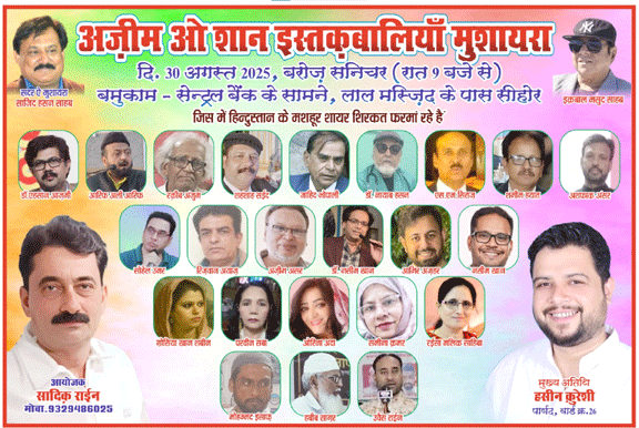 بھوپال:26؍اگست:انجمن فکرادب سیہور کے زیراہتمام 30اگست 2025 بروز سنیچر سینٹرل بینک کے سامنے لال مسجد کے پاس سیہور میں ایک عظیم الشان استقبالیہ مشاعرہ کاانعقاد کیاگیا ہے۔ جس کی صدارت معروف تعلیمی شخصیت اورادب پرور جناب حسن انجام دیں گے۔ معروف ادیب و شاعر جانب اقبال مسعود بطورمہمان ذی وقار اور علاقائی کونسلر حسین قریشی بطور مہمان خصوصی محفل مشاعرہ میں تشریف فرماہونگے۔ مشاعرہ میں شرکت کرنےو الے شعراء حضرات کے نام اس طرح ہیں۔ ڈاکٹراحسان اعظمی، عارف علی عارف، رقیب انجم، شہنشاہ سعید، زاہد بھوپالی، ایس ایم سراج، شمیم حیات، اشفاق انصر، سہیل عمر، رضوان ایاز، عظیم اثر، ڈاکٹر نسیم خان، عامر اظہر، نسیم خان،غوثیہ خان ثبین، پروین صبا، اورینہ ادا، ثمینہ قمر، رئیسہ ملک، محمدانصاف، حبیب ساغر اور اویس راعین قابل ذکر ہیں۔ مشاعرہ کے کنوینر اور تنظیم کے روح رواں جناب صادق راعین نے سبھی ادب دوستوں سے پروگرام میں شرکت کی درخواست کی ہے۔