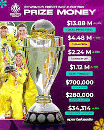 ”آئی سی سی نے ٹورنامنٹ کے ہر مرحلے کے لیے انعامی رقم میں بھی اضافہ کیا ہے۔ ورلڈ کپ جیتنے والی ٹیم کو اب 44.8 لاکھ امریکی ڈالر (تقریباً 39.42 کروڑ روپے) ملیں گے۔ یہ 2022 میں آسٹریلیا کی خواتین ٹیم کو ملنے والی 13.2 لاکھ امریکی ڈالر (11.62 کروڑ روپے) کی رقم سے دوگنا سے بھی زیادہ ہے۔ رنر اپ ٹیم کو 22.4 لاکھ امریکی ڈالر (تقریباً 19.71 کروڑ روپے) ملیں گے۔ شکست کھانے والے دونوں سیمی فائنلسٹوں کو 11.2 لاکھ امریکی ڈالر (9.86 کروڑ روپے) دیے جائیں گے۔