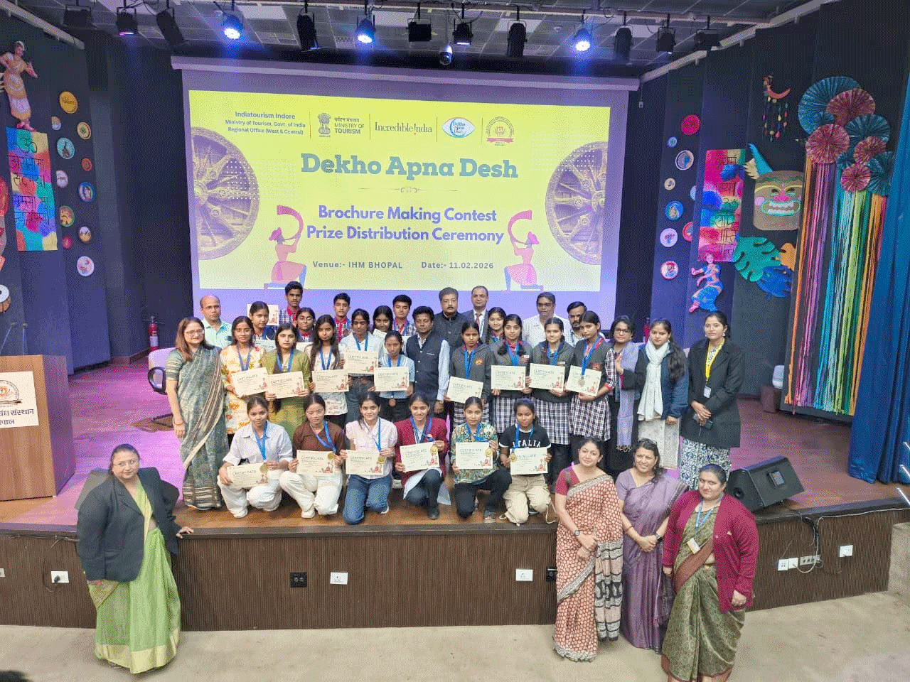 بھوپال:11؍فروری:انسٹی ٹیوٹ آف ہوٹل مینجمنٹ (آئی ایچ ایم)، بھوپال نے پرنسپل ڈاکٹر روہیت سرین کی قیادت میں انڈیا ٹورازم، ممبئی کے تعاون سے 11 فروری 2026 کو اررا کالونی کیمپس میں سیاحت تعلیم ایکسپو اور ’’دیکھو اپنا دیس‘‘ بروشر مقابلہ انعام تقسیم تقریب کا کامیاب انعقاد کیا۔ چیف گیسٹ ڈاکٹر ایل یا راجا ٹی، آئی اے ایس، سیکریٹری، ایم پی ٹورازم محکمہ اور ایم پی ٹورازم بورڈ ایم ڈی؛ مہمانوں میں شی ابھے اروند بیڈکر، آئی اے ایس، ایڈیشنل ایم ڈی اور شی پرم ویر سنگھ، تاج لیک فرنٹ جنرل منیجر شامل۔ بھوپال کے پانچ ستارہ ہوٹلوں کے نمائندوں نے تعلیمی-صنعتی ہم آہنگی کو مزید مستحکم کیا۔ ’’دیکھو اپنا دیس‘‘ تحریک (2020) گھریلو سیاحت اور ثقافتی وراثت کو فروغ دیتی ہے۔ تعلیم وزارت کے تعاون سے 15 نومبر-15 دسمبر 2024 میں پی ایم شری اسکولوں کے طلبہ نے بروشر بنائے؛ ریاستی سطح پر رتلام جواہر نوو دھیا ودyalya–1 نے پہلا انعام (₹10,000) جیتا۔ برہانپور جیسے چھوٹے شہروں کی بھی شاندار شرکت۔ ایکسپو میں طلبہ کو ہوٹل مینجمنٹ، پاک فن، بیکری، سیاحت وغیرہ کی لائیو معلومات ملیں؛ مظاہرے نے آئی ایچ ایم کی عملی تعلیم کو اجاگر کیا۔ تقریب نے اکیڈمک، حکومت اور انڈسٹری کے تعاون سے ماہر سیاحتی پیشہ ور تیار کرنے کی عزم کو دہرایا۔