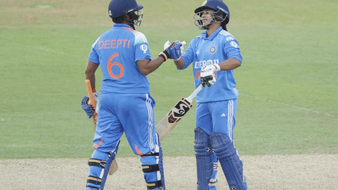 ساؤتھمپٹن، 17 جولائی(یو این آئی) دیپتی شرما (ناٹ آؤٹ 62) اور جیمائمہ روڈریگز (48) کی شاندار بلے بازی کی بدولت ہندستانی خواتین کرکٹ ٹیم نے پہلے ایک روزہ میچ میں انگلینڈ کو 10 گیندیں باقی رہتے ہوئے چار وکٹ سے شکست دے دی۔ اس کامیابی کے ساتھ ہندستان نے تین میچوں کی سیریز میں ایک- صفر کی برتری حاصل کر لی۔ دیپتی شرما کو شاندار کارکردگی پر ’پلیئر آف دی میچ قرار دیا گیا۔ ہندستان کی جانب سے 259 رنز کے ہدف کے تعاقب کرتے ہوئے پرتیکا راول اور سمرتی مندھانا نے پہلی وکٹ کے لیے 48 رنوں کی شاندار شراکت داری کی۔ آٹھویں اوور میں لورین بیل نے سمرتی مندھانا (28) کو آؤٹ کر کے انگلینڈ کو پہلی کامیابی دلائی۔ انیسویں اوور میں صوفی ایکلسٹن نے پرتیکا راول (36) کو آؤٹ کیا۔ ہرلین دیول (27) رن بناکر آؤٹ ہوئیں۔ اس کے بعدجیمائمہ روڈریگز اور دیپتی شرماکے درمیان 90 رنوں کی شراکت ہوئی۔ کپتان ہرمین پریت کور 17 رنز بنا کر آؤٹ ہوئیں۔ 42ویں اوور میں لورین فائلر نے جیمائمہ روڈریگز (48) کو آؤٹ کر کے اس اہم شراکت کا خاتمہ کیا۔ رشا گھوش10 رن بنا کر آؤٹ ہوئیں۔ ہندستان نے 48.2 اوورز میں چھ وکٹوں کے نقصان پر 262 رنز بنا کر میچ چار وکٹوں سے جیت لیا۔دیپتی شرمانے 64 گیندوں پر تین چوکے اور ایک چھکا لگاتے ہوئے ناقابل شکست 62 رن بنائے، جبکہ امن جوت کور 20 رنز کے ساتھ ناٹ آؤٹ رہیں۔انگلینڈ کی جانب سےشارلٹ ڈیننے دو وکٹیں حاصل کیں، جبکہ لورین بیل، صوفی ایکلسٹن اور لورین فائلر نے ایک ایک کھلاڑی کو آؤٹ کیا۔