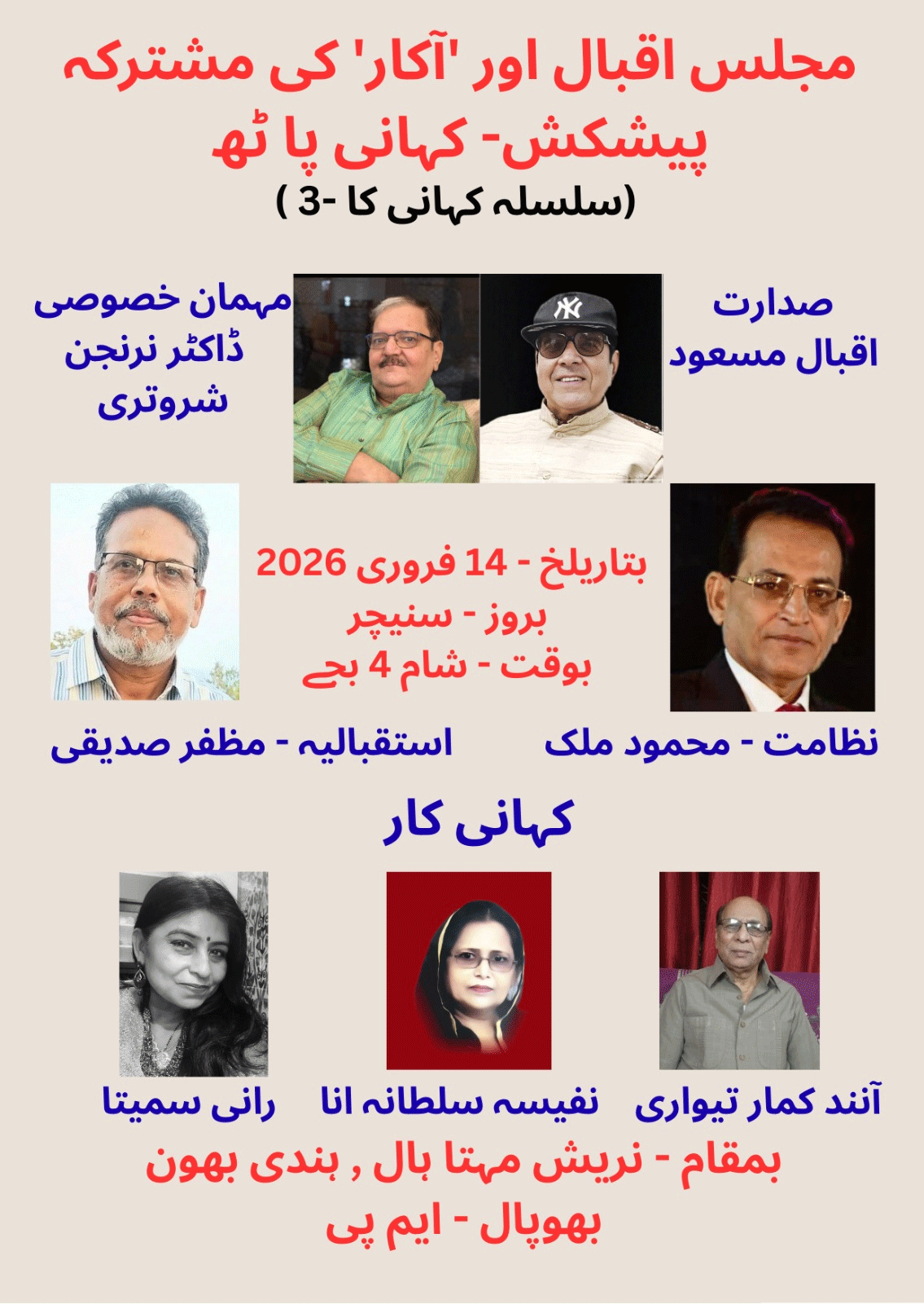 بھوپال 12فروری:’’ مجلس اقبال‘‘ اور’’آکار‘‘ کے مشترکہ زیر اہتمام’’کہانی پاٹھ‘‘کا انعقاد14فروری بروز سنیچر شام چار بجے نریش مہتا ہال ہندی بھون بھوپال میں کیا گیا ہے۔ پروگرام کی صدارت جناب اقبال مسعود فرمائیں گے۔ ڈاکٹر نرنجن شروتری بطور مہمان خصوصی شرکت فرمائیں گے۔نظامت کے فرائض محمود ملک انجام دینگے۔پروگرام میں افسانہ نگار مظفر صدیقی کااستقبال کیاجائے گا، اس کے علاوہ آنند کمار تیواری ، نفیسہ سلطانہ انا، اور رانی سمیتا اپنی کہانیاں پڑھ کرسنائیں گی۔پروگرام کے منتظمین نے اداب نواز لوگوں سے شرکت کی درخواست کی ہے۔