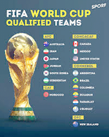 بیجنگ، یکم اپریل (یو این آئی): 2026 فیفا ورلڈ کپ کے لیے کوالیفائی کرنے والی تمام 48 ٹیموں کی گروپ وار فہرست درج ذیل ہے:گروپ اے: میکسیکو، جنوبی کوریا، جنوبی افریقہ، چیک جمہوریہ۔