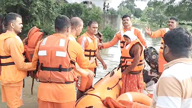 بیڈ23 ستمبر: مہاراشٹر کے کئی اضلاع میں مسلسل ہونے والی بارش نے عوامی زندگی کو بری طرح متاثر کیا ہے۔ بیڈ، دھاراشیو اور سولاپور اضلاع میں پانی بھرنے سے سیلابی حالات پیدا ہو گئے ہیں۔ اس صورتحال کو دیکھتے ہوئے انتظامیہ کی درخواست پر این ڈی آر ایف کی ٹیمیں فوری طور پر موقع پر پہنچیں اور رات بھر جاری رہنے والے آپریشن میں درجنوں افراد کو محفوظ مقامات پر منتقل کیا گیا۔ بیڈ ضلع کے مجل گاؤں تحصیل کے سنداس چنچولے علاقے میں پانی گھروں میں داخل ہو گیا، جس کی وجہ سے مقامی باشندے پھنس گئے۔ این ڈی آر ایف کی ٹیم نے رات بھر مسلسل کارروائی کرتے ہوئے 26 افراد کو بحفاظت نکالا۔ سب سے اہم لمحہ اس وقت آیا جب منگل کی صبح ایک نوزائیدہ بچہ اور ایک خاتون بھی کامیابی سے ریسکیو کیے گئے۔ اس کے بعد دیہی عوام نے راحت کی سانس لی اور اہلکاروں کے حوصلے کی تعریف کی۔ اسی طرح دھاراشیو ضلع کے کپلاپوری گاؤں میں بھی شدید بارش سے حالات بگڑ گئے۔ پانی گھروں تک پہنچ گیا اور گاؤں والے اندر ہی محصور ہوگئے۔ این ڈی آر ایف کی ٹیم نے مشکل حالات کے باوجود رات بھر آپریشن جاری رکھا اور 9 شہریوں کو محفوظ مقام تک پہنچانے میں کامیابی حاصل کی۔ سولاپور ضلع میں بھی کچھ ایسے ہی حالات رہے۔ این ڈی آر ایف کی ٹیم نے یہاں مختلف علاقوں میں ریسکیو آپریشن چلایا اور 59 افراد کو نکالا، جن میں خواتین، بچے اور بزرگ شامل تھے۔ مقامی انتظامیہ اور عوام نے این ڈی آر ایف کے بروقت ایکشن اور بہادری کو سراہا۔ ان کا کہنا تھا کہ وقت پر مدد نہ پہنچتی تو بڑی تباہی کا اندیشہ تھا۔ انتظامیہ نے بھی اہلکاروں کی پیشہ ورانہ مہارت اور نڈر خدمت کو خراج تحسین پیش کیا۔ اس سے پہلے، ہندوستانی فوج بھی بیڈ ضلع کے گھاٹ پنپری اور آس پاس کے گاؤں میں مدد کے لیے آگے آئی تھی، جہاں پانی کی سطح بلند ہونے سے راستے بند ہو گئے تھے۔ ضلع کلکٹر کی درخواست پر فوج نے مقامی شہریوں کو نکالنے اور امدادی سرگرمیوں میں حصہ لیا۔