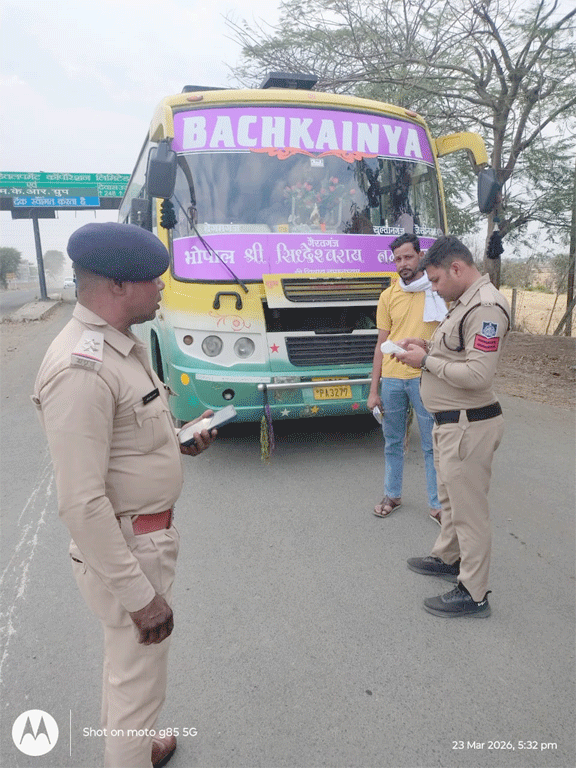 رائسن: 23؍مارچ:علاقے میں مسافر بسوں کے آپریشن کو لے کر پولیس انتظامیہ نے اب سختی دکھانا شروع کر دی ہے۔ ٹرانسپورٹ محکمہ کی گائیڈ لائنز اور قواعد کی خلاف ورزی کرنے والے بس آپریٹروں کے خلاف پیر کے روز مقامی پولیس نے خصوصی چیکنگ مہم چلائی، جس کے تحت تین مسافر بسوں پر چالانی کارروائی کی گئی۔موصولہ معلومات کے مطابق بھوپال-ساگر-سلوانی روٹ پر چلنے والی شکتی ٹرانسپورٹ اور بچکئیاں ٹرانسپورٹ کمپنی کی تین بسوں کو پولیس ٹیم نے جانچ کے لیے روکا۔ تفصیلی معائنہ کے دوران یہ بات سامنے آئی کہ بس کے ڈرائیور اور کنڈیکٹر حکومت کی جانب سے مقررہ ڈریس کوڈ پر عمل نہیں کر رہے تھے۔قواعد کی اس خلاف ورزی پر پولیس نے فوری کارروائی کرتے ہوئے تینوں بسوں پر 500-500 روپے کا جرمانہ عائد کیا۔