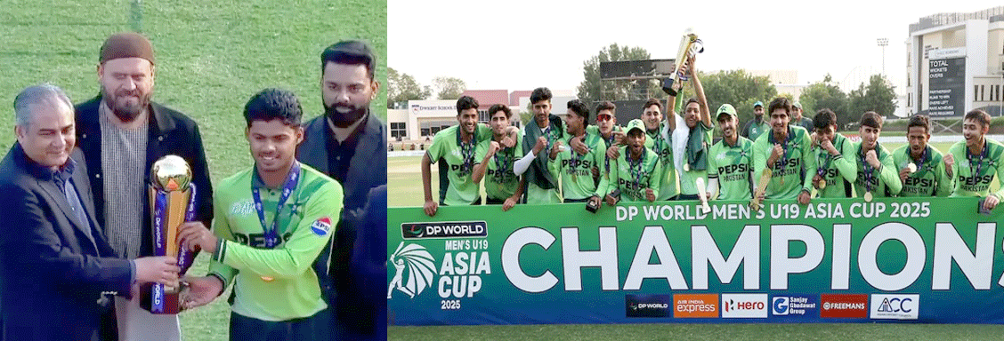 دبئی:22؍دسمبر:پاکستان نے دوسری بار انڈر 19 ایشیا کپ کا ٹائٹل اپنے نام کیا ہے۔ ٹیم نے اتوار کو کھیلے گئے فائنل میں بھارت کو 191 رنز سے شکست دی۔ دبئی میں آئی سی سی اکیڈمی میں سمیر منہاس کی شاندار اننگز کی بدولت پاکستان نے بھارت کو 348 رنز کا بڑا ہدف دیا۔جواب میں ہندوستانی ٹیم 26.2 اوورز میں 159 رنز پر آل آؤٹ ہوگئی۔ اوپنر ویبھو سوریاونشی صرف 26 رنز بنا سکے۔ دیپیش دیویندرن نے سب سے زیادہ 36 رنز بنائے۔ پاکستان کی جانب سے علی رضا نے چار جبکہ محمد صیام، حذیفہ احسن اور عبدالسبحان نے دو دو وکٹیں حاصل کیں۔ایشین کرکٹ کونسل (اے سی سی) اور پاکستان کرکٹ بورڈ (پی سی بی) کے چیئرمین محسن نقوی نے فاتح پاکستانی ٹیم اور ان کے کپتان کو ٹرافی پیش کی۔ تاہم ہندوستانی کھلاڑیوں نے نقوی سے رنر اپ میڈل لینے سے انکار کردیا۔ کھلاڑیوں نےا سٹیج سے اتر کر آئی سی سی کے رکن مبشر عثمانی سے میڈلز وصول کیے۔ سینئر ٹیم کا ایشیا کپ جیتنے والی ہندوستانی ٹیم نے نقوی سے ٹرافی لینے سے انکار کر دیا تھا۔