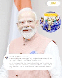 سوشل میڈیا پلیٹ فارم ‘ایکس’ پر ایک پوسٹ میں، وزیر اعظم نے ٹیم کے چار کھلاڑیوں جوشنا چنپا، ابھے سنگھ، ویلون سینتھل کمار اور انآہت سنگھ کی “زبردست لگن اور پختہ عزم” کی تعریف کرتے ہوئے کہا کہ ان کی یہ کامیابی پورے ملک کے لیے فخر کا باعث بنی ہے۔وزیر اعظم نے اس تاریخی کارنامے کے ہندوستانی کھیلوں پر پڑنے والے وسیع اثرات کا حوالہ دیتے ہوئے کہا، “یہ جیت ہمارے نوجوانوں کے درمیان اسکواش کی مقبولیت میں بھی اضافہ کرے گی۔