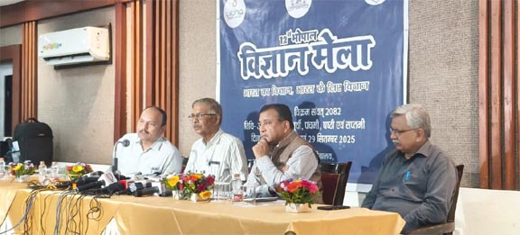 بھوپال _ 18/ ستمبر( پریس ریلیز) آج راجدھانی بھوپال کے ہوٹل تلاش میں منعقدہ ایک پریس کانفرنس میں ڈاکٹر انیل کوٹھاری، ڈائریکٹر جنرل، ایم پی کونسل آف سائنس اینڈ ٹکنالوجی، بھوپال، اور ڈاکٹر اموگ گپتا، صدر، وگیان بھارتی، مدھیہ بھارت صوبہ، اور برکت اللہ یونیورسٹی کے وائس چانسلر، نے میڈیا کے نمائندوں کو بتایا کہ بھوپال میں 12واں سائنس میلہ26 سے 29 ستمبر 2025 کے دوران برکت اللہ یونیورسٹی کے ہیلی پیڈ گراؤنڈ اور جِیان وگیان بھون میں منعقد کیا جا رہا ہے۔ یہ میلہ وگیان بھارتی-مدھیہ بھارت پرانت، مدھیہ پردیش سائنس و ٹیکنالوجی کونسل اور برکت اللہ یونیورسٹی کے اشتراک سے منعقد ہوگا۔ سائنس اور جدت کے ذریعے سماجی و ماحولیاتی مسائل کا حل پیش کرنا،نئی نسل کو سائنس و ٹیکنالوجی کی طرف مائل کرنا،مکالمے اور اختراعات کو فروغ دینا،ترقی یافتہ بھارت 2047 کے لئے سائنس کو بنیاد بنانا