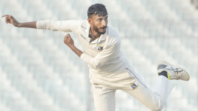 کلیانی،10 فروری ( یو این آئی ) شہباز احمد (4 وکٹیں) کی قیادت میں گیند بازوں کی عمدہ کارکردگی کی بدولت بنگال نے منگل کے روز آندھرا پردیش کو 90 رنز سے شکست دے دی۔ اس فتح کے ساتھ ہی بنگال نے ریکارڈ 19ویں مرتبہ رنجی ٹرافی ٹورنامنٹ کے سیمی فائنل میں رسائی حاصل کر لی ہے۔ پہلی اننگز میں 299 رنز کی تاریخی اننگز کھیلنے والے سدیپ کمار گھرامی کو ‘پلیئر آف دی میچ’ قرار دیا گیا۔آندھرا پردیش نے آج اپنی دوسری اننگز کا آغاز گزشتہ روز کے اسکور 64 رنز 3 کھلاڑی آؤٹ سے کیا۔ تاہم بنگال کے گیند بازوں نے صبح سے ہی دباؤ برقرار رکھا۔ شہباز احمد نے آندھرا کے کپتان رکی بھوئی (30) کو آؤٹ کر کے دن کی پہلی کامیابی حاصل کی۔ سورج سندھو جیسوال نے کے وی ششی کانت کو صفر پر پویلین بھیج کر حریف ٹیم کی کمر توڑ دی۔ ایک وقت پر نیتش کمار ریڈی (90) اور تریپورانہ وجے (46) نے آٹھویں وکٹ کے لیے 85 رنز کی شراکت قائم کر کے بنگال کے لیے مشکلات پیدا کیں، لیکن شہباز احمد نے نیتش کو آؤٹ کر کے اس شراکت کا خاتمہ کیا۔ آندھرا پردیش کی پوری ٹیم اپنی دوسری اننگز میں 244 رنز بنا کر آؤٹ ہوگئی اور بنگال نے 90 رنز سے میچ جیت لیا۔بنگال کی پہلی اننگز کےبڑے اسکور نے میچ میں ان کی پوزیشن پہلے ہی مضبوط کر دی تھی۔ اس کے بعد گیندبازوں نے باقی کام تمام کردیا ۔شہباز احمد نے 4، سورج سندھو جیسوال نے 2، جبکہ آکاش دیپ، سمنت گپتا اور انستوپ مجمدار نے ایک ایک وکٹ حاصل کی۔