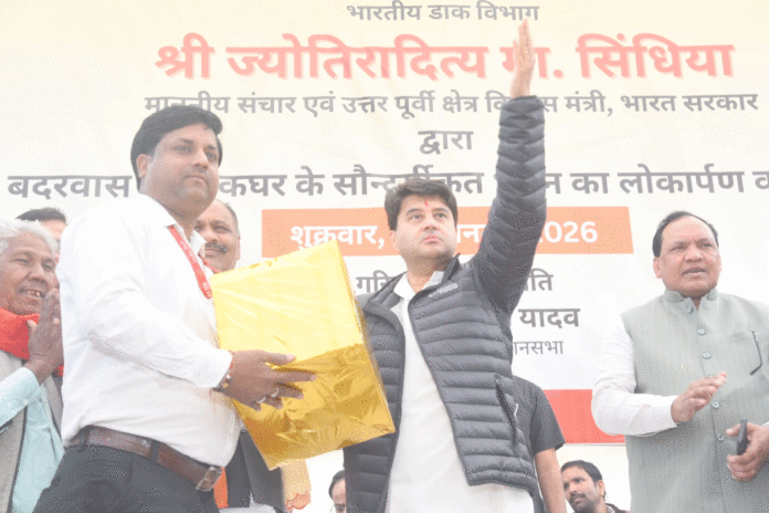 گُنا:09؍جنوری:مرکزی وزیرِ مواصلات جیوتی رادتیہ سندھیا کی تحریک اور رہنمائی میں، شیوپوری ڈاک ڈویژن میں محکمہ ڈاک کی جانب سے پروجیکٹ ایرو / Look & Feel کے تحت تمام ڈاک گھروں کی تزئین کاری کا کام کیا جا رہا ہے۔ اسی سلسلے میں آج بتاریخ 9 جنوری 2026 کو شیوپوری ڈاک ڈویژن کے بدَرواس سب ڈاک گھر کے تزئین و آرائش کے کام کا افتتاح خود وزیرِ مواصلات سندھیا نے کیا۔