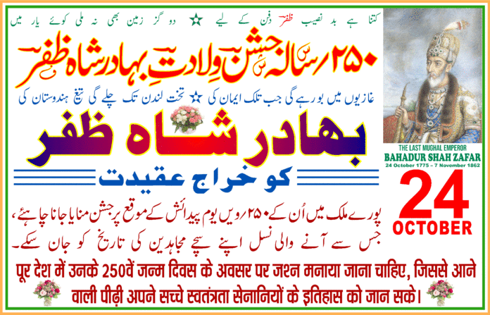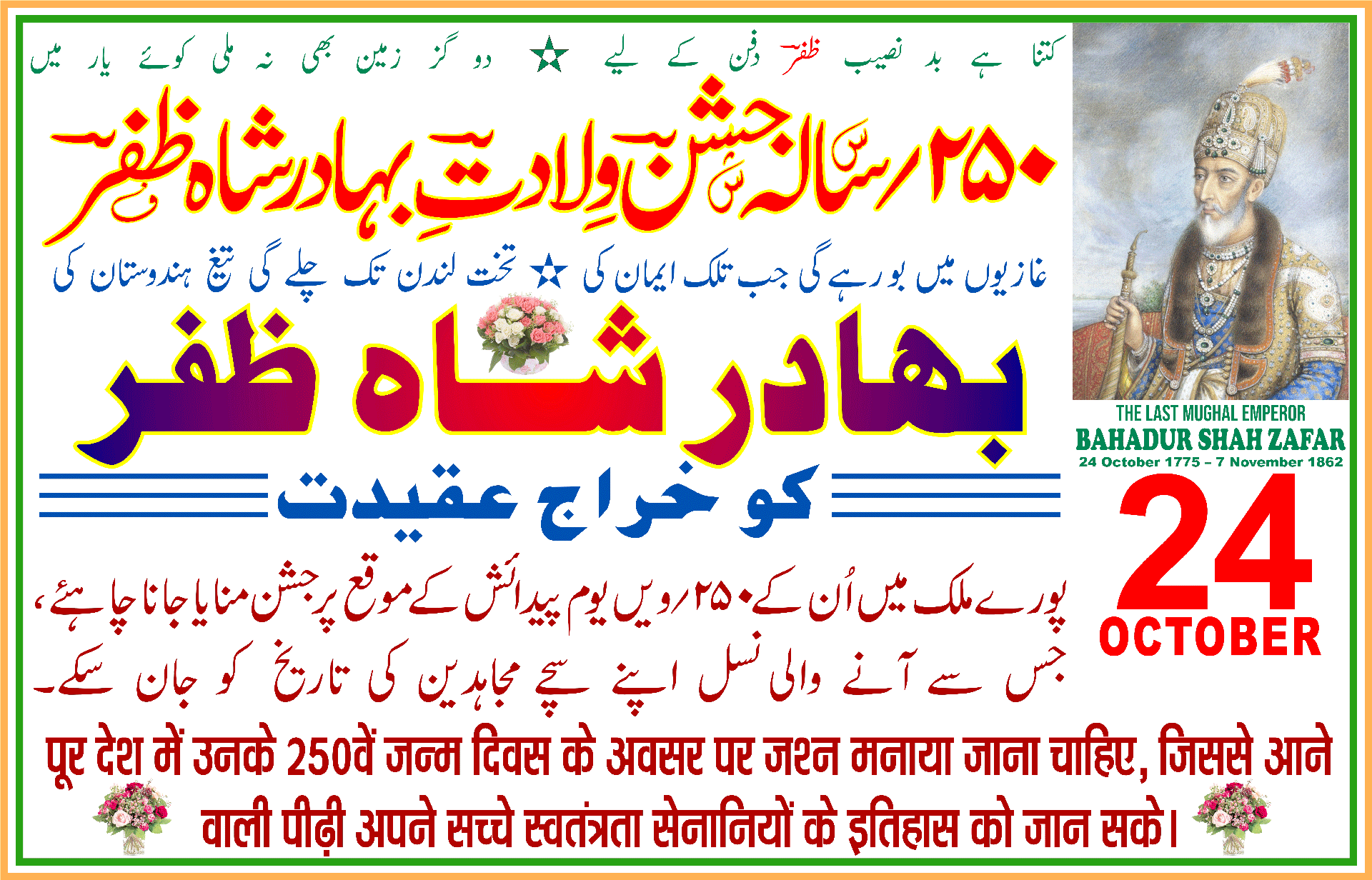 24 اکتوبر 1775کو پیدا ہونے والے بہادر شاہ ظفر وہ عظیم بادشاہ تھے جنہوں نے زوال کے اندھیروں میں بھی امید و حوصلے کی شمع روشن رکھی۔ اگرچہ ان کے دور میں سلطنت دہلی کی حدیں محض لال قلعے تک محدود تھیں، مگر ظفر کا دل پورے بھارت کے خواب سے منور تھا۔ وہ شاعر بھی تھے، صوفی بھی، اور ایک درد مند دل رکھنے والے محبِ وطن انسان بھی۔