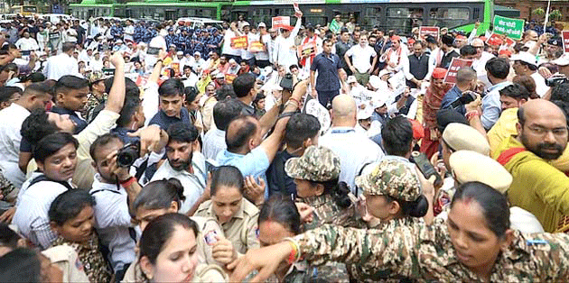 نئی دہلی11اگست: الیکشن کمیشن کے خلاف اپوزیشن اراکین پارلیمنٹ کی ناراضگی دن بہ دن بڑھتی جا رہی ہے۔ آج حزب اختلاف کے قائد راہل گاندھی کی قیادت میں 300 سے زائد اراکین پارلیمنٹ نے الیکشن کمیشن دفتر کی طرف مارچ کیا، لیکن دہلی پولیس کے ذریعہ سبھی کو حراست میں لے کر انھیں پارلیمنٹ اسٹریٹ پولیس اسٹیشن لے جایا گیا۔ تازہ ترین خبروں کے مطابق راہل گاندھی سمیت سبھی اراکین پارلیمنٹ کو دہلی پولیس نے چھوڑ دیا ہے۔ دراصل پولیس نے اراکین پارلیمنٹ کے مارچ کو الیکشن کمیشن تک جانے کی اجازت نہیں دی تھی۔ اس کے باوجود اپوزیشن اراکین پارلیمنٹ مارچ نکال رہے تھے، جس کے بعد پولیس نے کارروائی کرتے ہوئے انھیں حراست میں لے لیا تھا۔ الیکشن کمیشن کے باہر دہلی پولیس کے ساتھ پیرا ملٹری فورس کے جوانوں کی تعیناتی کی گئی تھی۔ بیریکیڈنگ کر کے مارچ کو روکا گیا تھا۔ کئی اراکین پارلیمنٹ بیریکیڈ پر چڑھ گئے اور کود گئے۔ اتر پردیش کے سابق وزیر اعلیٰ اکھلیش یادو بھی بیریکیڈ سے کود گئے تھے۔ ان کے علاوہ ترنمول کانگریس اراکین پارلیمنٹ ساگریکا گھوش اور مہوا موئترا بھی بیریکیڈ پر چڑھ گئی تھیں۔ بعد میں سبھی کو حراست میں لے کر دہلی پولیس نے بس میں بٹھایا اور پارلیمنٹ اسٹریٹ پولیس اسٹیشن لے جایا گیا۔ حراست میں لیے جانے کے دوران راہل گاندھی نے میڈیا سے بات کرتے ہوئے کہا کہ ’’حقیقت یہ ہے کہ وہ (الیکشن کمیشن) بول نہیں سکتے۔ سچائی ملک کے سامنے ہے۔ یہ لڑائی سیاسی نہیں ہے۔ یہ آئین بچانے کی لڑائی ہے۔ یہ لڑائی ایک شخص-ایک ووٹ کی ہے۔ ہم ایک صاف ستھری ووٹر لسٹ چاہتے ہیں۔